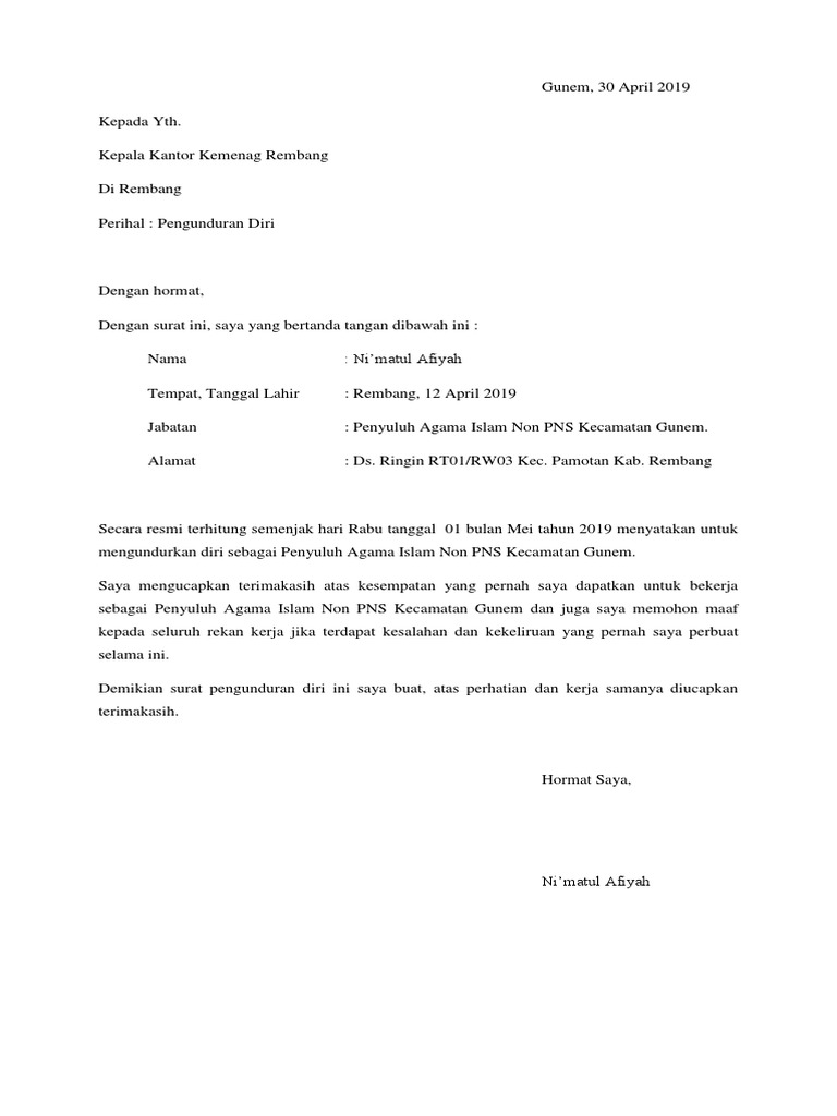 Kedua, berisi maksud dari surat tersebut dalam hal ini mengundurkan diri menjadi. Contoh surat pengunduran diri kerja yang baik dan sopan. Kepada bapak ketua lembaga pendidikan di desa somodaran solo di tempat. Berikut beberapa contoh surat pengunduran diri atau surat resign dengan penulisan yang benar dan sopan, dilengkapi dengan trik dan tips pembuatannya. Pada artikel ini, penulis memberikan beragam jenis surat pengunduran diri yang dimulai dari contoh surat kenapa orang beralih menjadi pegawai negeri sipil (pns)?