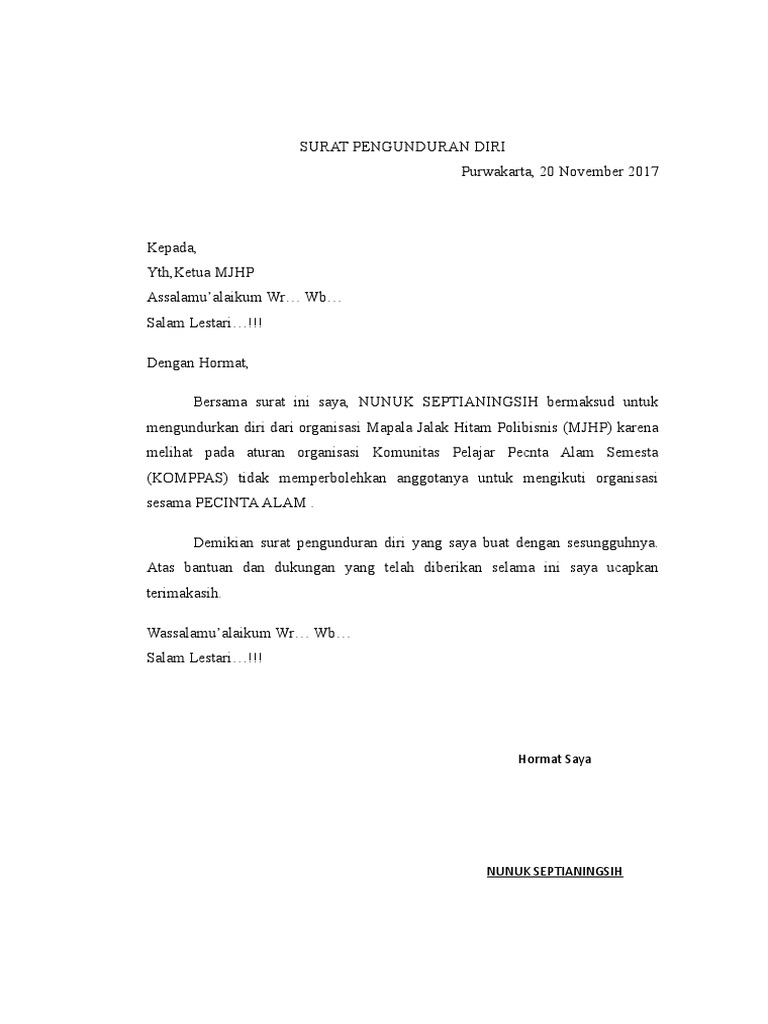 Contoh alasan bisa anda ganti sesuai dengan alasan resign anda. Surat pengunduran diri adalah surat yang berisi pernyataan resmi bahwa seseorang mengundurkan diri dari suatu instansi perusahaan. Meski begitu, pengunduran diri tersebut harus dilakukan secara sopan dan resmi melalui surat pengunduran diri. Contoh surat pengunduran diri organisasi dari orang tua. Contoh surat pengunduran diri bahasa inggris. Hal ini dikarenakan si penulis menganggap bahwa perusahaannya merupakan perusahaan unggulan, terbukti dengan harapan yang diutarakan dalam surat pengunduran diri tersebut. Dan agar lebih menunjukkan sisi. Ketika seseorang akan resign dari tempat kerja, umumnya mereka akan mencari contoh surat pengunduran diri atau surat resign yang sesuai dengan bidang kerjanya. Seluruh organisasi baik yang berkecimpung di dunia masyarakat, sekolah, universitas. Contoh surat pengunduran diri dari organisasi. Contoh surat pengunduran diri diatas tampak lebih kompleks dan lengkap dari sebelumnya. Contoh surat pengunduran diri organisasi. Surat pengunduran diri untuk organisasi juga memiliki format dan strukturnya tersendiri.